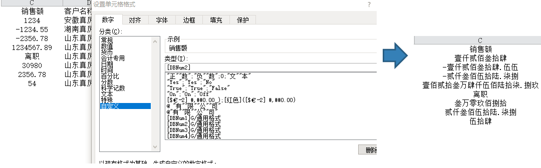 3、大写金额,这个财务会经常用到,[DBnum1]为大写的一、二、三、四,比如1234,显示为“一千两百三十四”;[DBnum2]为大写的壹、贰、叁、肆,比如1234,显示为壹仟贰佰叁拾肆,单位大写也不一样;[DBnum3]为数字小写,单位大写,比如1234显示为1千2百3十4;