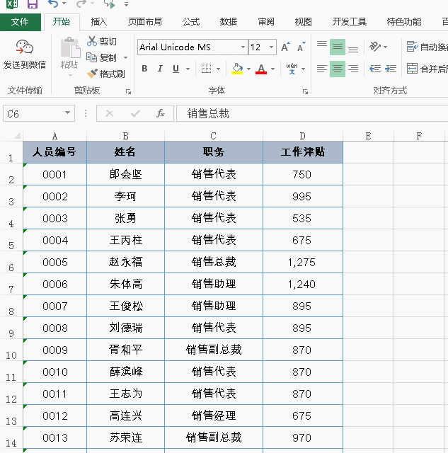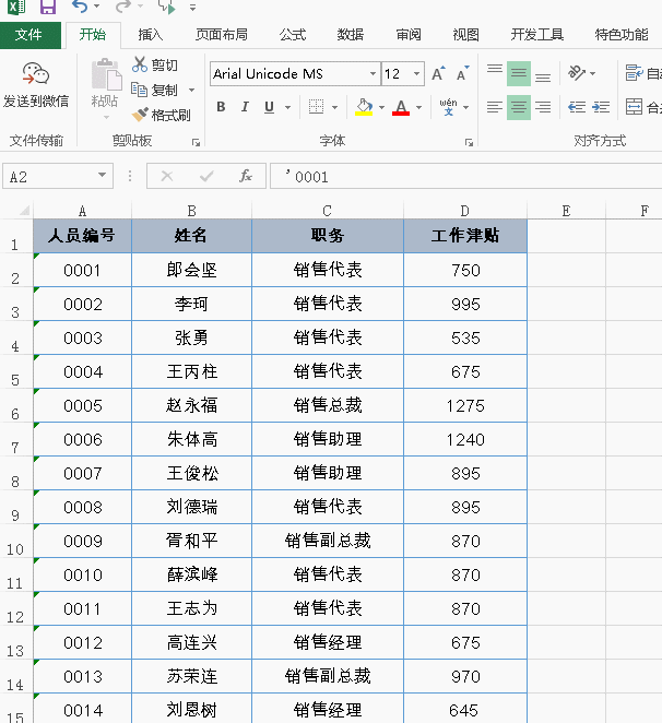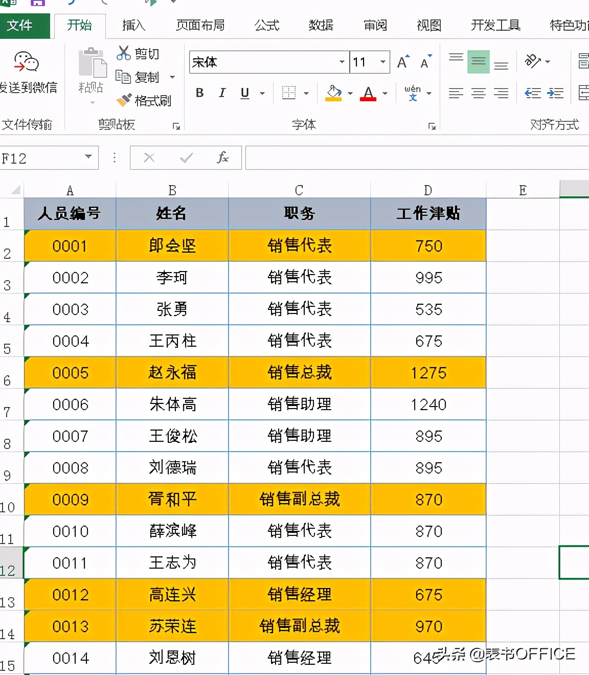 比如在下表中,我们要对0001、0005、0009、0012、0013五条记录填充黄色背景,应该怎么操作。