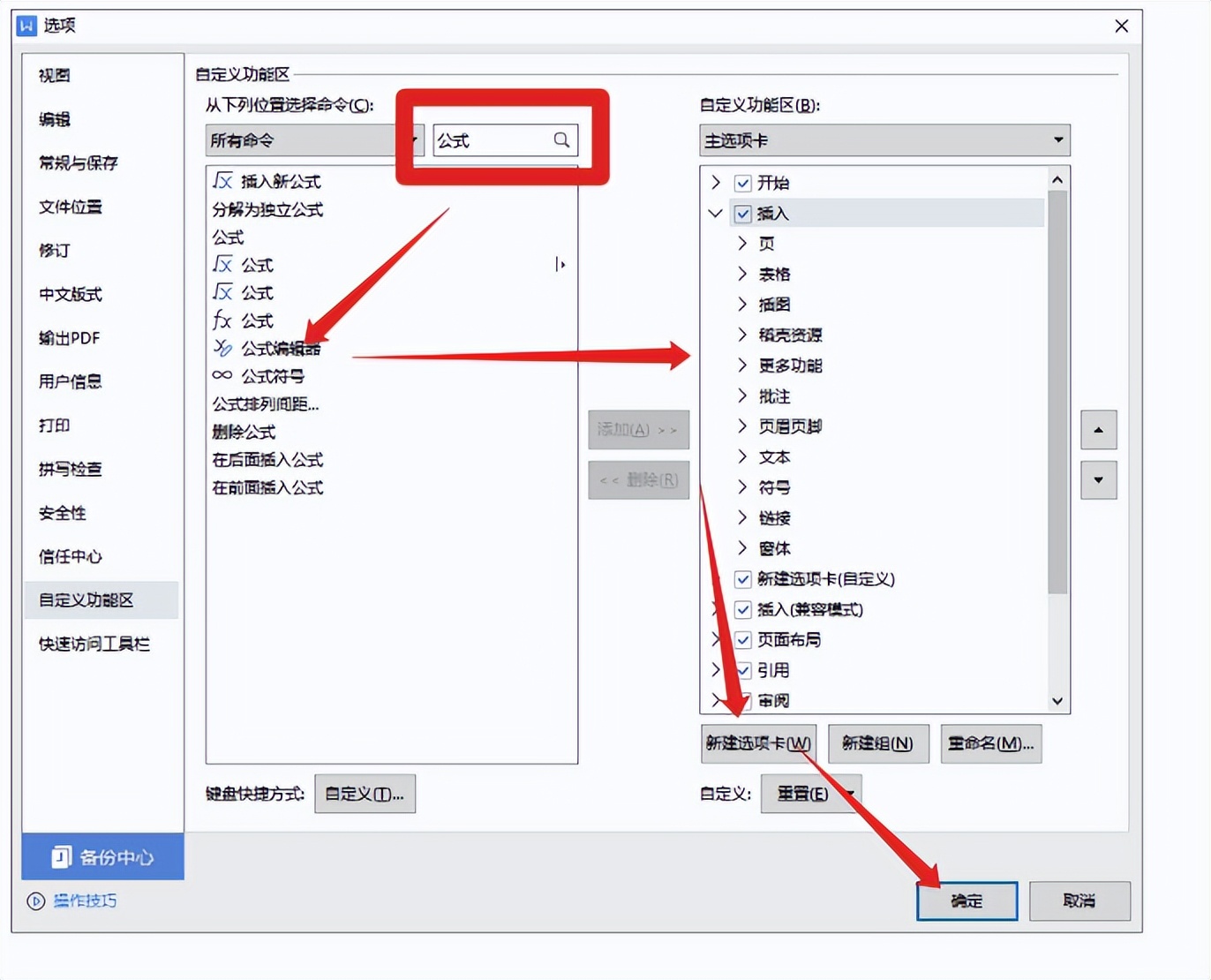 2、在弹出的【选项】对话框中,搜索框内录入【公式】,带出【公式编辑器】字样后,在右侧自定义功能区内【插入】-【公式】下【新建选项卡】-点击中间的添加按钮,增加到右侧功能区后,点击【确定】