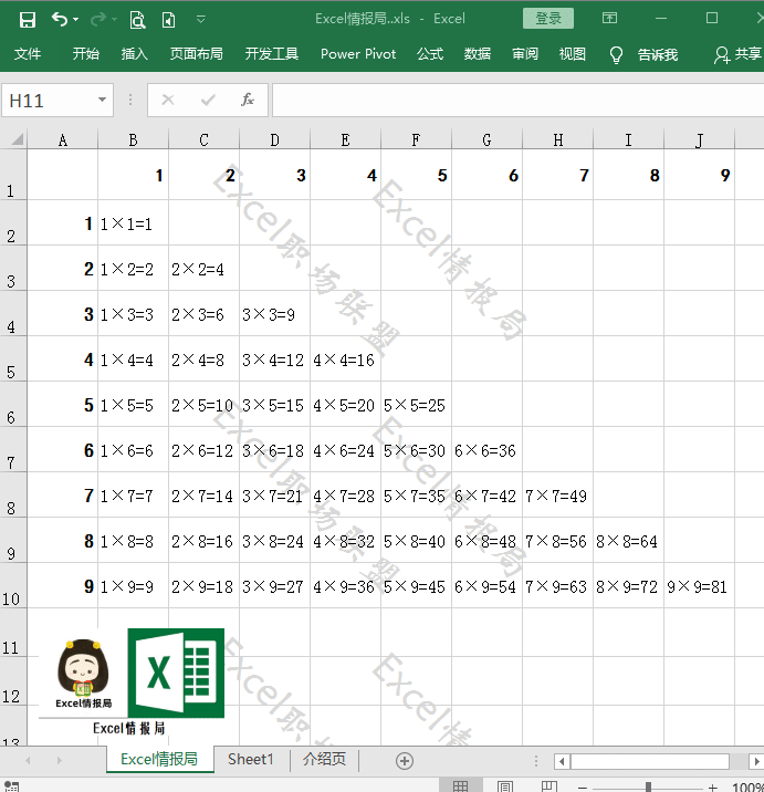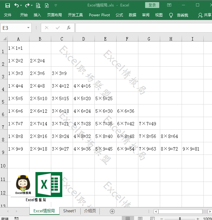 选中A1:I9单元格数据区域,按下快捷键“Ctrl+G”,打开“定位”对话框,选择定位“常量”,将九九乘法口诀表的数据部分批量选中,然后可以将字体加粗,添加内边框和外边框,填充单元格底色。如下图所示:
