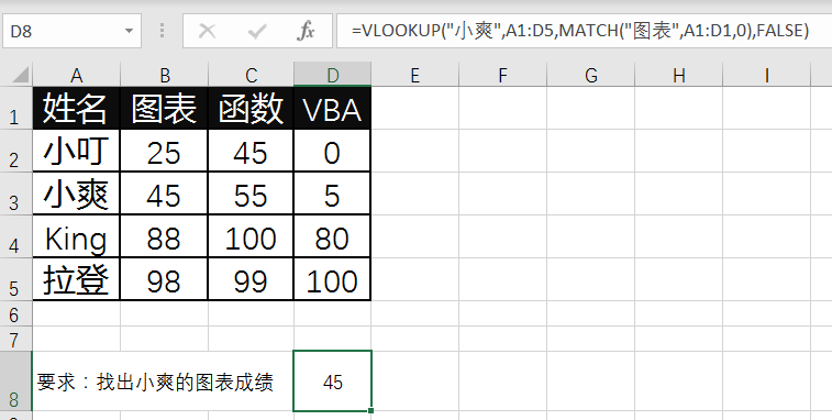 =VLOOKUP("小爽",{"姓名","图表";"小爽","45"},MATCH("图表",{"姓名","图表"},0),False)