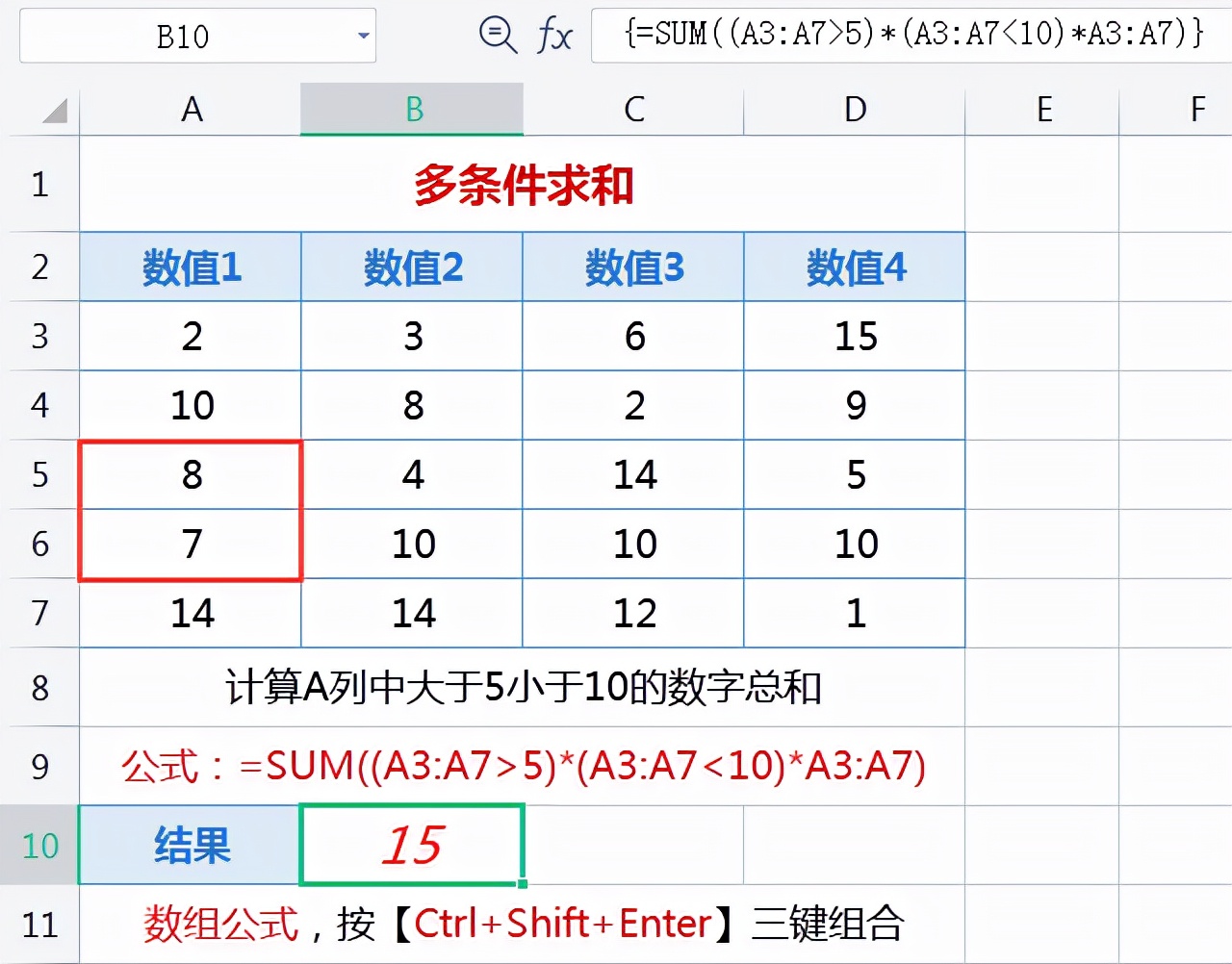 对下图中A3:A7区域大于5小于10的数据进行求和,输入公式:=SUM((A3:A7>5)*(A3:A7<10)*A3:A7),同时按【Ctrl+Shift+Enter】三键组合,这样就计算出了A3:A7区域所有大于5小于10的数值总和。见下图: