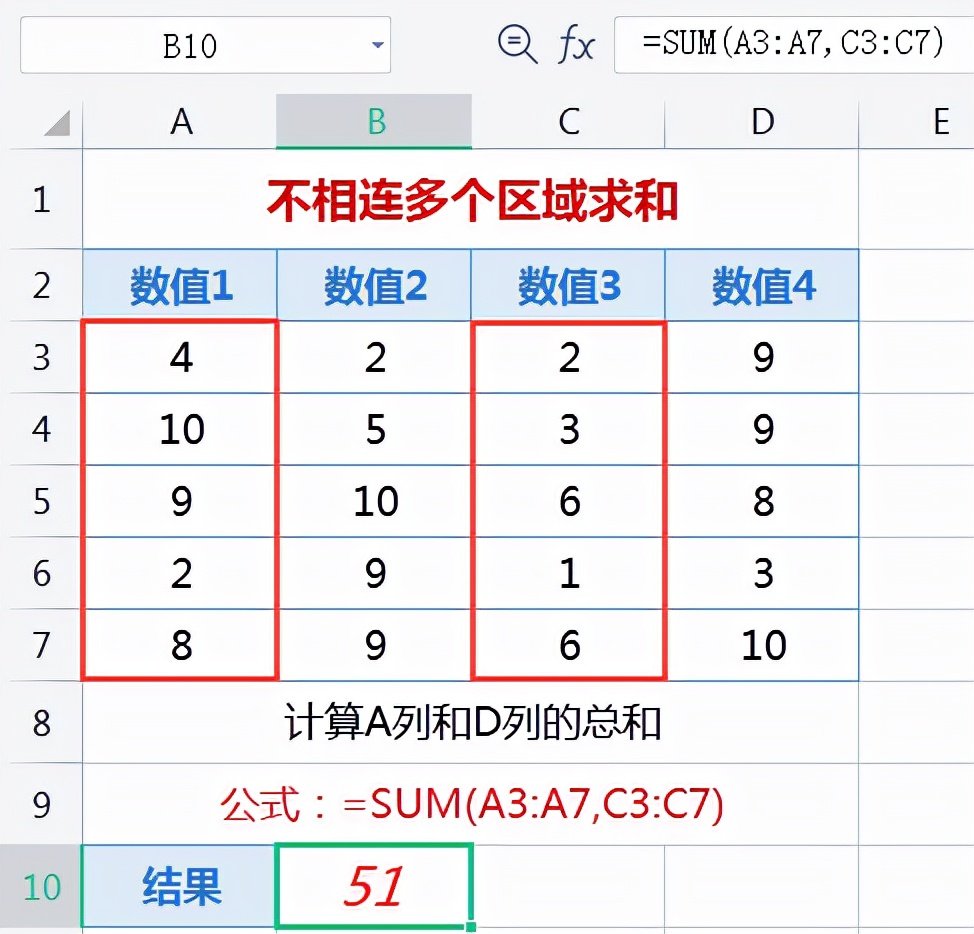 在单元格输入公式:=SUM(A3:A7,C3:C7),按回车即可计算出A3:A7和C3:C7的数值总和。和选择单个单元格操作一样,拖动选择A3:A7区域后,按住Ctrl键不放,在选择C3:C7,同样自动添加逗号,要是不按住Ctrl键或不输入逗号,你选择下一个区域时自动替换上一次选择的区域。见下图: