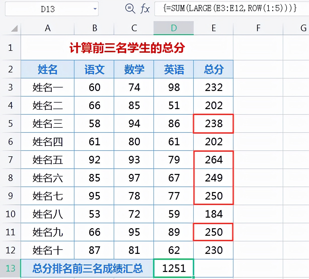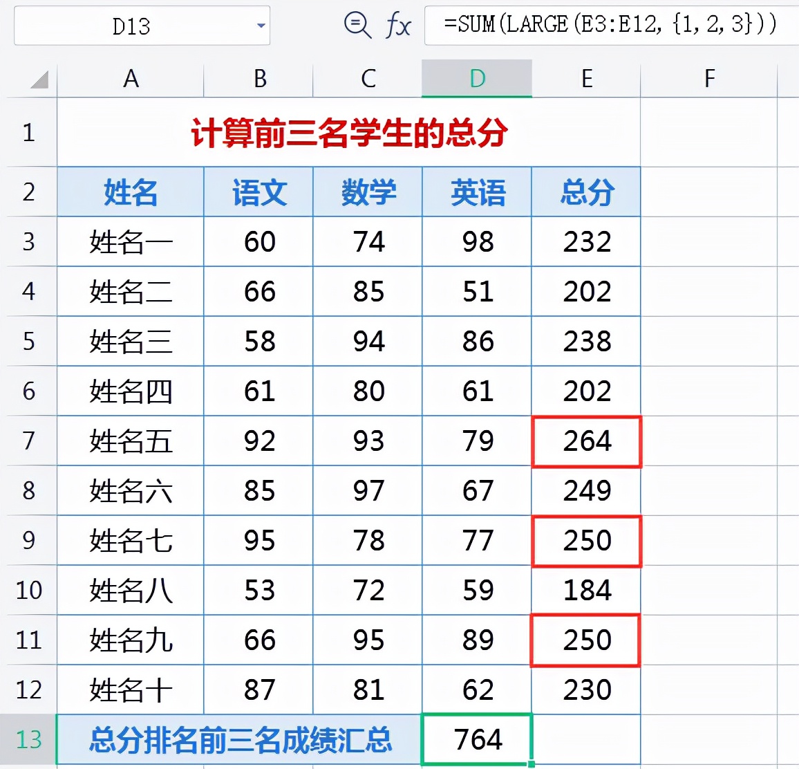 对下图中E3:E12区域总分排在前三名的成绩进行提取汇总,在D13单元格输入公式:=SUM(LARGE(E3:E12,{1,2,3})),回车后即可得出计算结果为764。见下图: