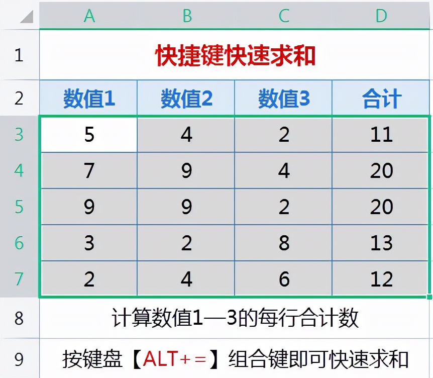 当我们在辛辛苦苦录入=SUM()时,别人已经计算出了多行合计数,并且只需要按一下键盘上的组合键。
