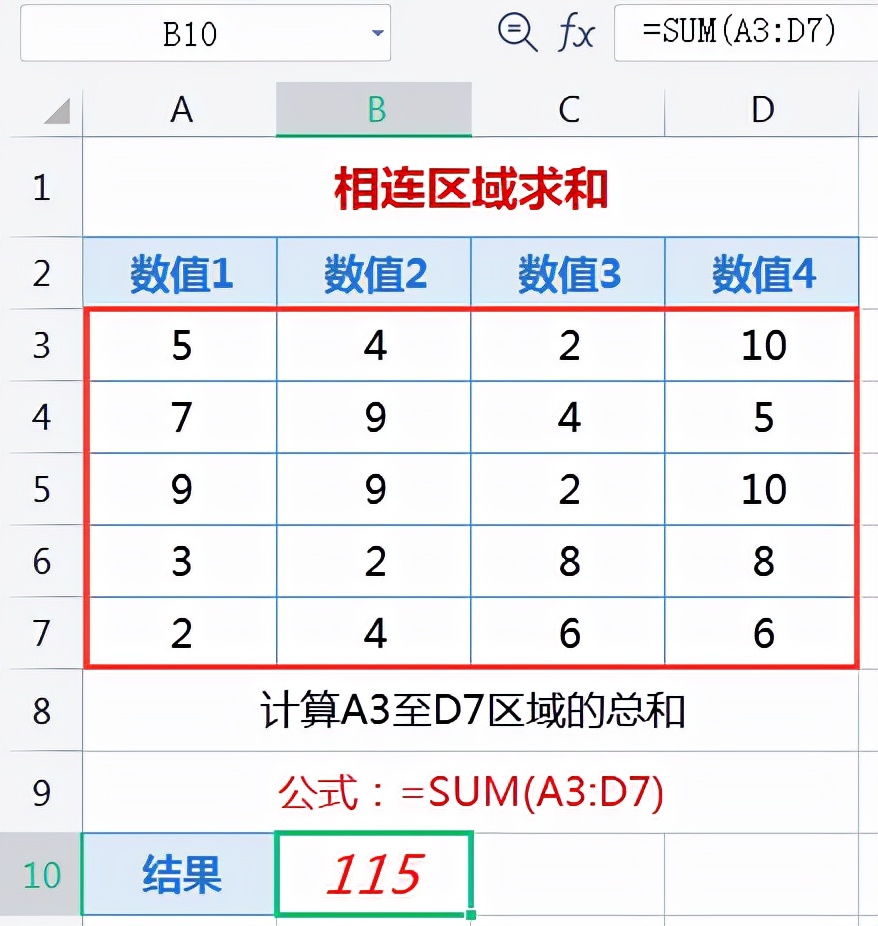 输入公式:=SUM(A3:D7),按回车键即可计算出A3到D7所有数字的总和。见下图: