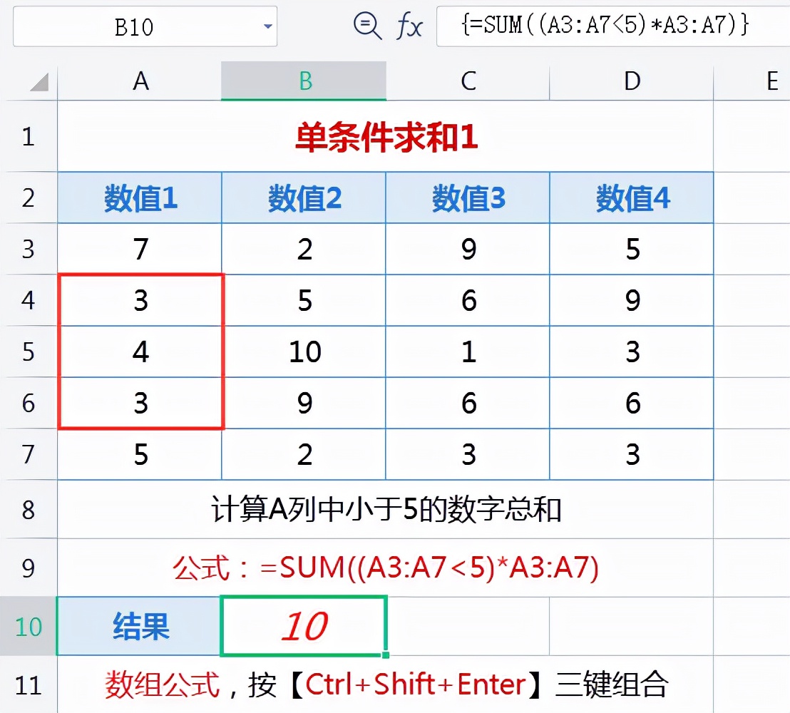 对下图中A3:A7区域小于5的单元格进行求和,输入公式:=SUM((A3:A7<5)*A3:A7),重点来了,同时按【Ctrl+Shift+Enter】三键组合,这样就计算出了A3:A7区域所有小于5的数值总和。你会发现,刚才输入的公式自动被{}括住,因为这是数组公式。