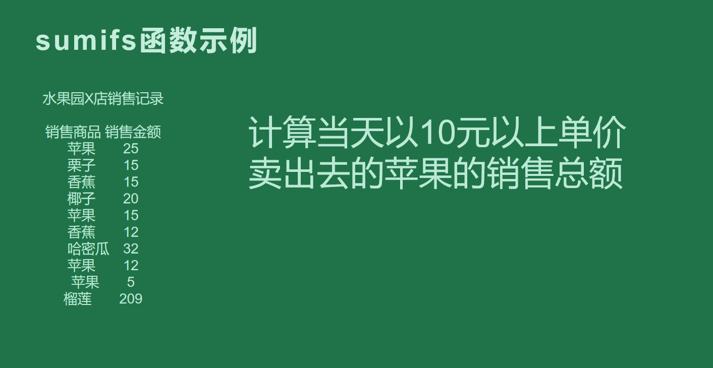 sumifs函数主要用于多条件求和场景。例如,下图描述的场景,我们想计算当天以10元以上单价卖出的苹果的销售总额,这边有两个条件,一个是10元以上单价的,另一个是苹果。我们要计算销售总额。用之前的sum函数和sumif函数都不行。这时候就可以是多条件求和