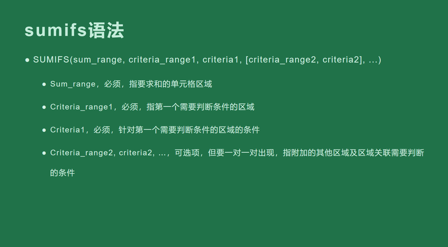 我们先看看sumi发生的语法,参见如下图,这个函数包含的参数比较多,且跟之前sumif的参数有差异。我们具体看看,第一个参数是sum_range,是我们要求和的单元格区域,第二个条件、第三个条件是一对,分别是creiteria_range1,指第一个需要判断条件的区域,criterial1,是针对c'riteria_range1区域进行判断的条件。后面是可选参数,都是用来进行条件判断的,需要像第二,第三个参数一样,一对一对的输入,最多可以输入127对条件,