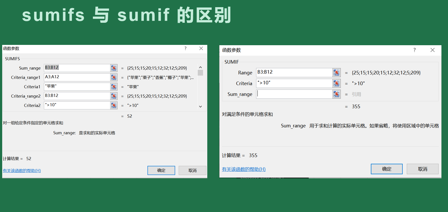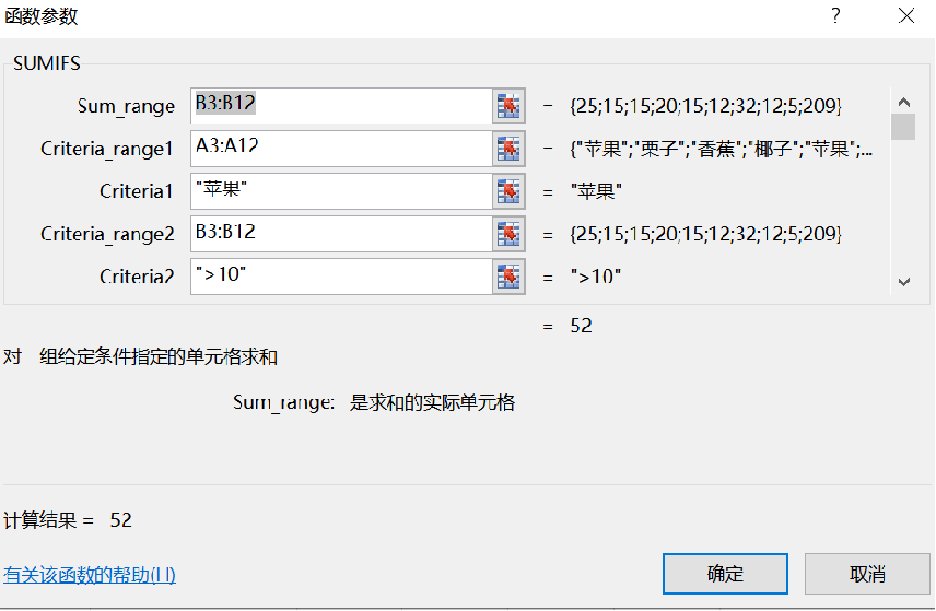 =SUMIFS(B3:B12,A3:A12,"苹果",B3:B12,">10")