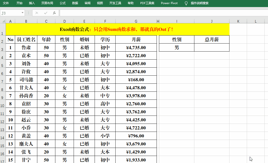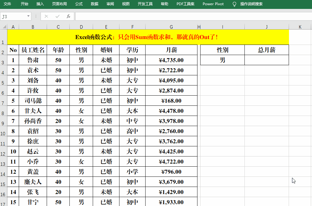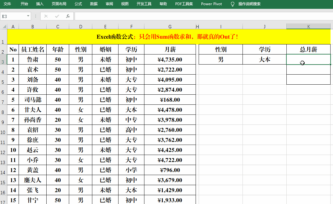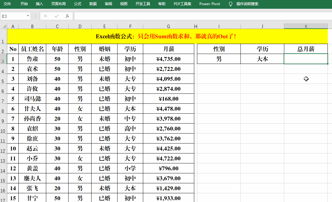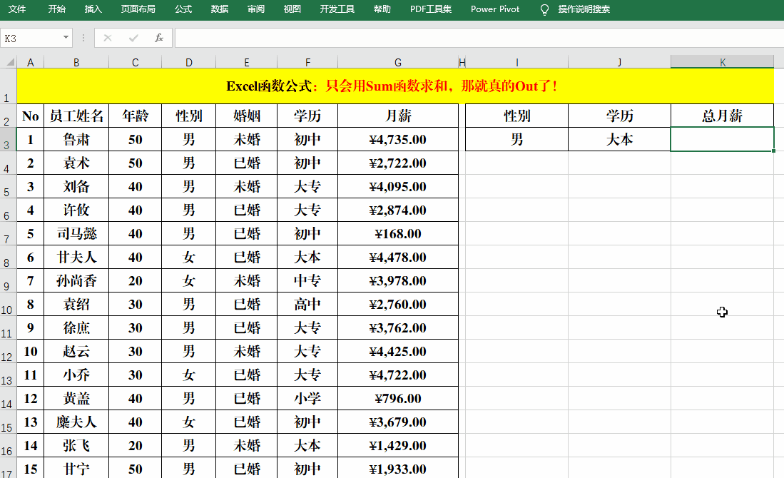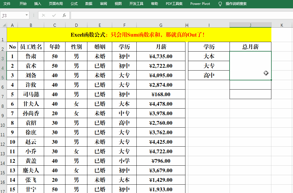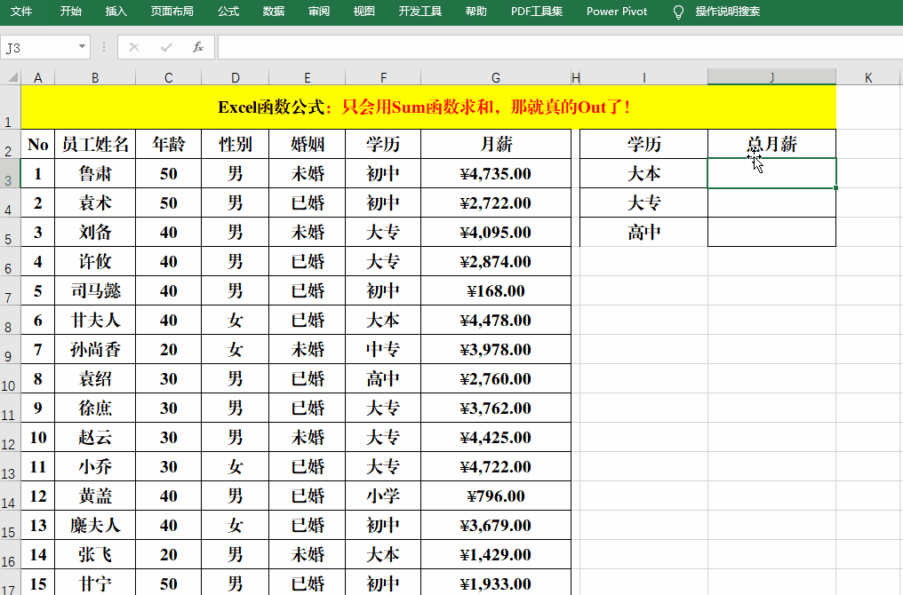 公式中就是用Sumproduct分别计算出学历为“大本”、“大专”和“高中”的“月薪”,然后用Sum再求和。