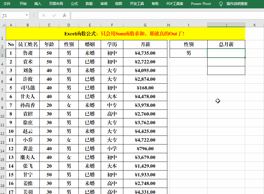 目的:按“性别”统计相应“学历”的总“月薪”。