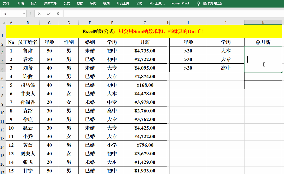 目的:统计“年龄”>30岁,“学历”为“大本、大专、高中”的总“月薪”。