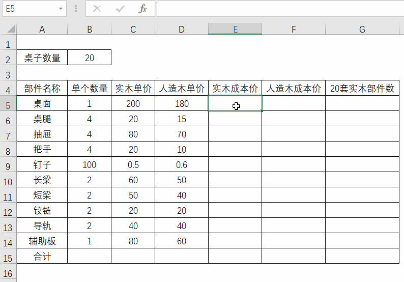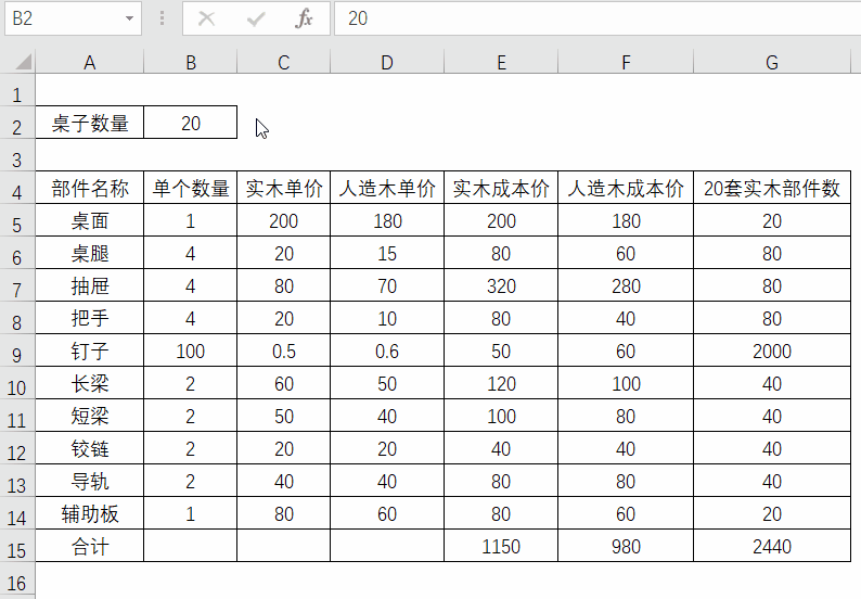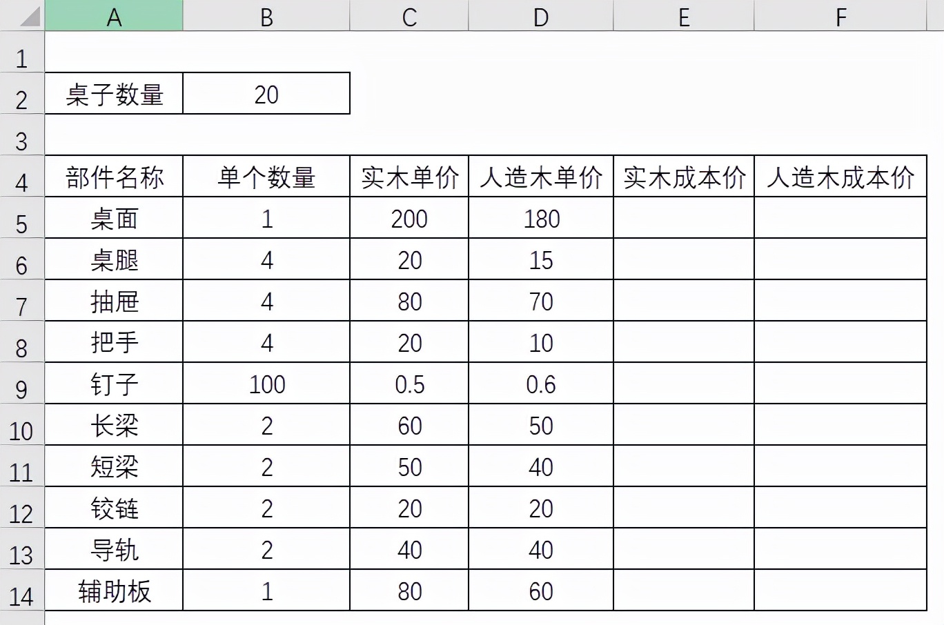 示例:计算实木成本价,人造木成本价,20套实木桌子部件数量。