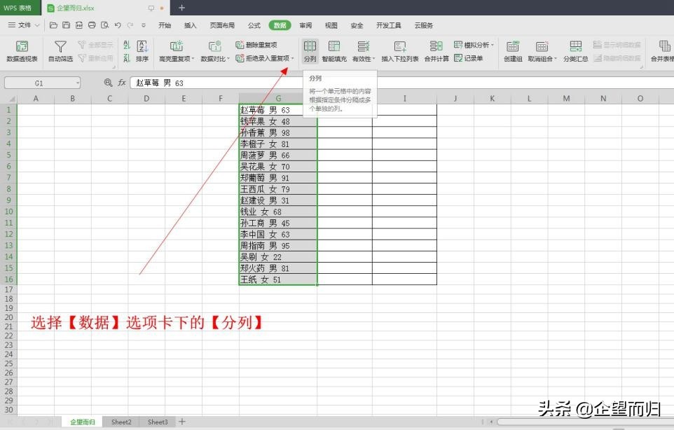 大家好,在工作表中,每个单元格的内容包含姓名、性别和年龄,我们要把这些数据分开来,对于较多的单元格来说,复制粘贴耗时又繁琐,大大降低了工作效率,今天为大家介绍一种分列方法,轻松分列数据