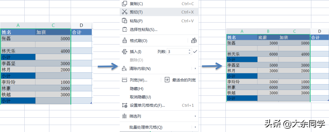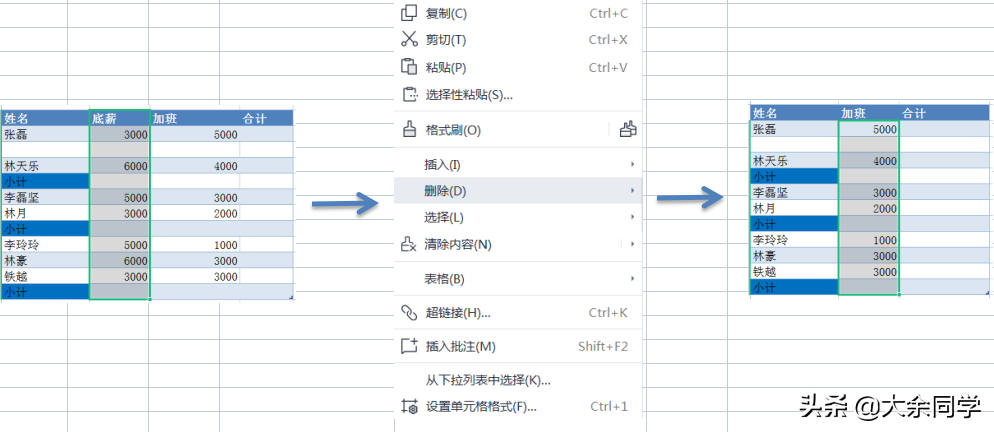 2.行列的删除:选中你想要删除的那一列,点击右键,选中删除即可,删除后后面一列自动前进一列。如果想删除某一行,操作方法等同。