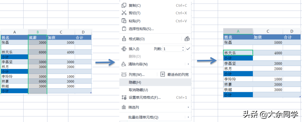 3.行列的隐藏:选中你想要隐藏的那一列,点击右键,选中隐藏即可,隐藏后你是可以发现哪一列被隐藏了的,看下面的截图,你会发现A列和C列之间少了一个B列,这就是和删除行列的主要区别。