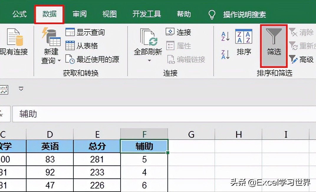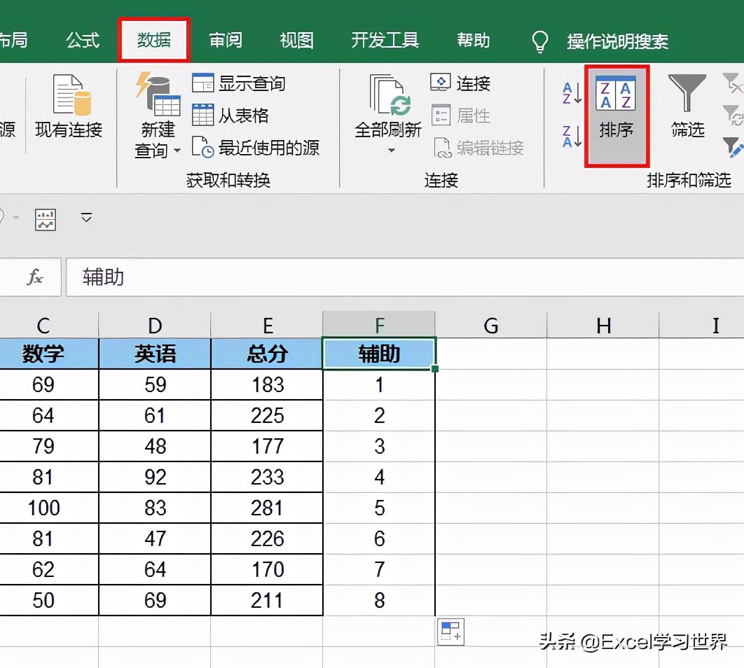 6. 在弹出的对话框中对“辅助”列按“升序”排序 --> 点击“确定”