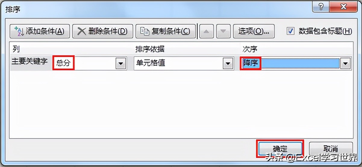 4. 在弹出的对话框中对“总分”进行“降序”排序 --> 点击“确定”