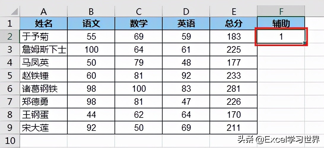 1. 将 F 列设置为辅助列 --> 在 F2 单元格中输入“1”