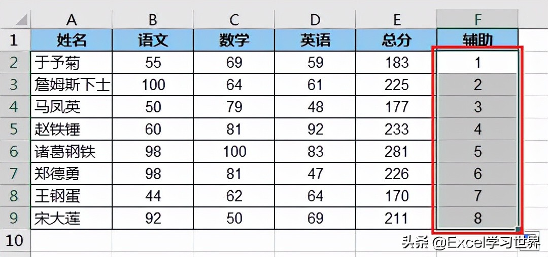 2. 选中 F2 单元格 --> 按住 Ctrl 键向下拖动,从而生成一列递增序列