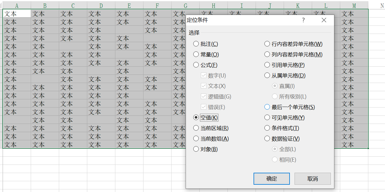 选中单元格区域->菜单栏选择“开始”->查找和选择->定位条件->选中空值即可选中所有空单元格