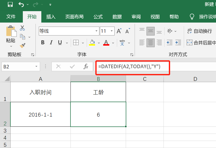 如下图,要计算员工的工龄,A2表示入职时间,TODAY()函数表示今天,Y表示以年的方式统计,DATEDIF函数就计算出两个日期相隔多少年数。
