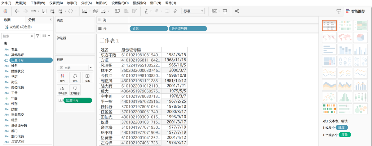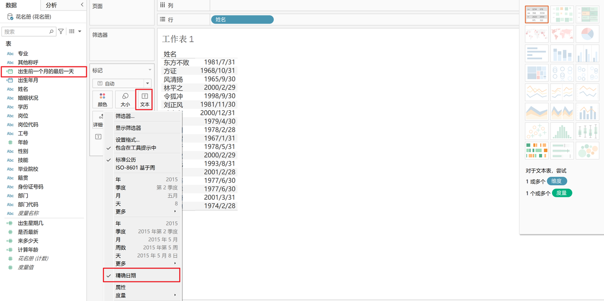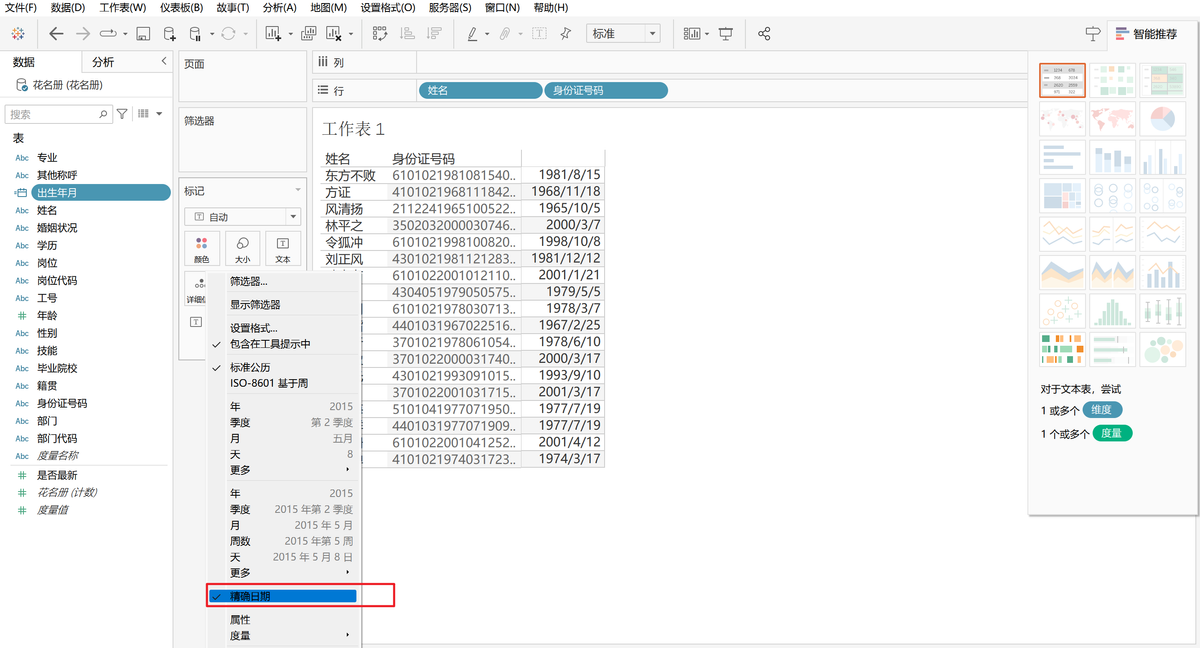 然后把出生年月字段拖到文本上面,显示为精确日期即可