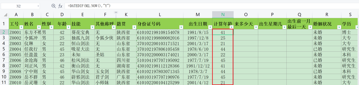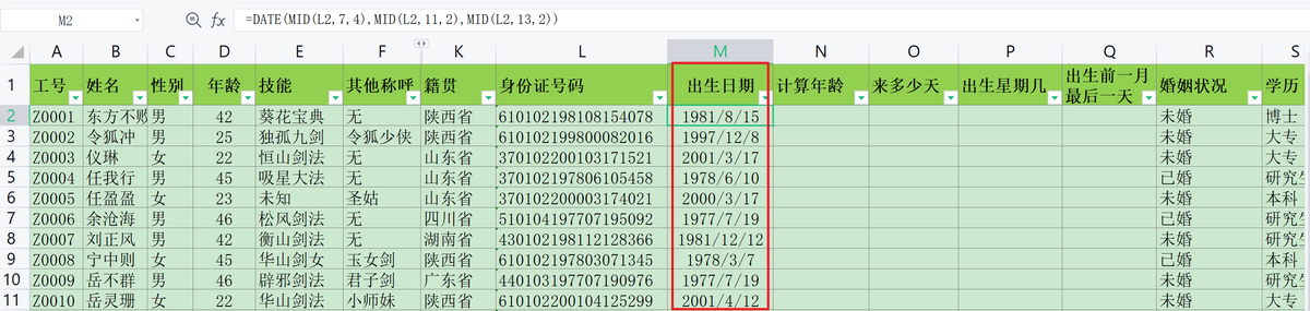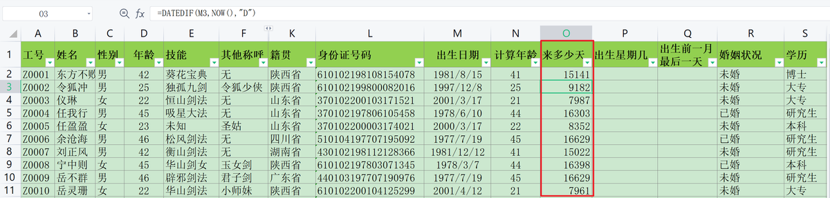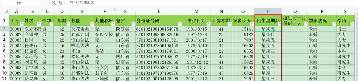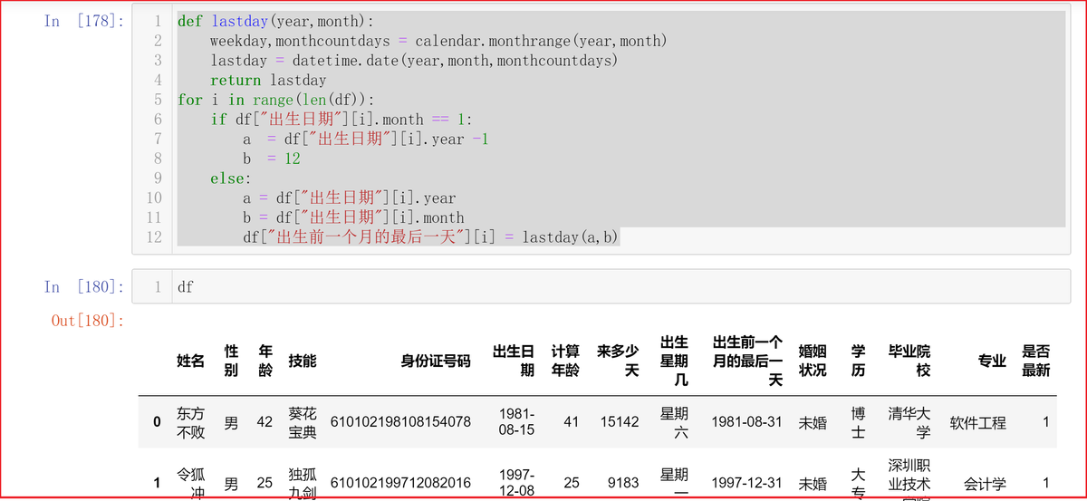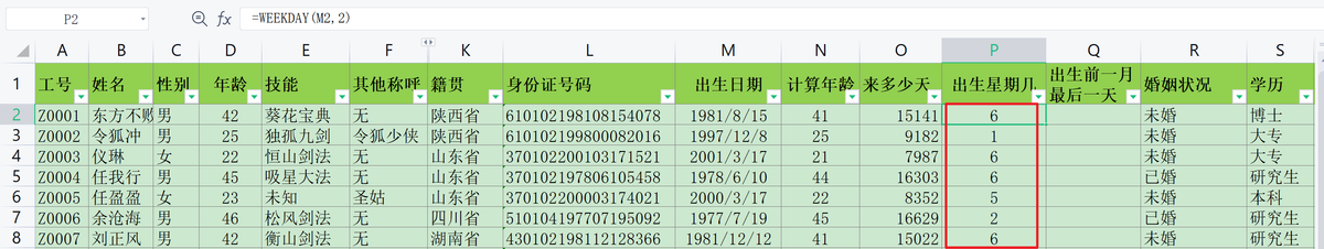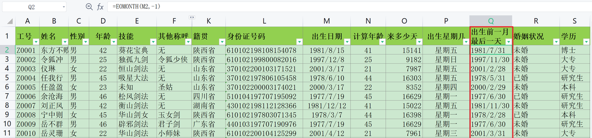 '出生日期','计算年龄','来多少天','出生星期几','出生前一个月的最后一天','婚姻状况','学历',
