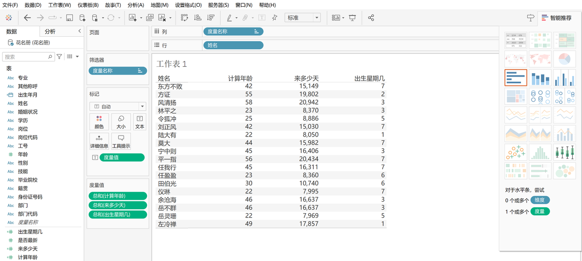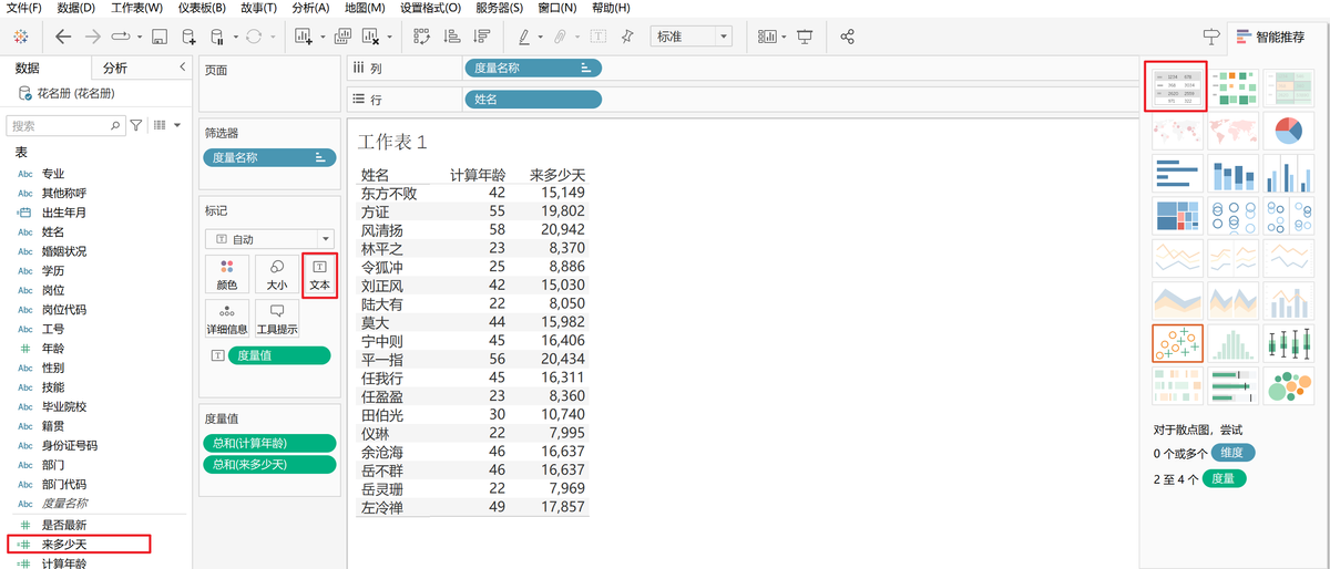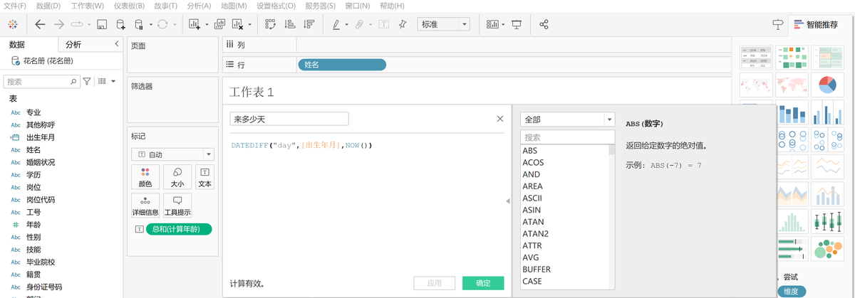 创建计算字段“来多少天”,输入公式:DATEDIFF("day",[出生年月],NOW())
