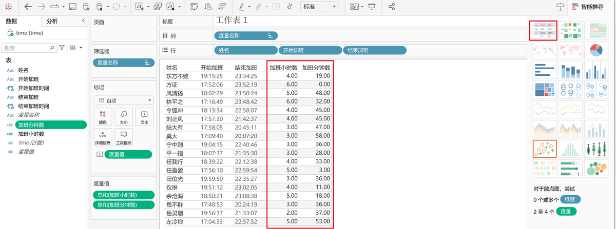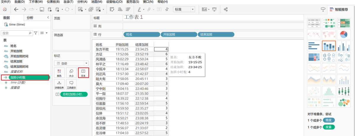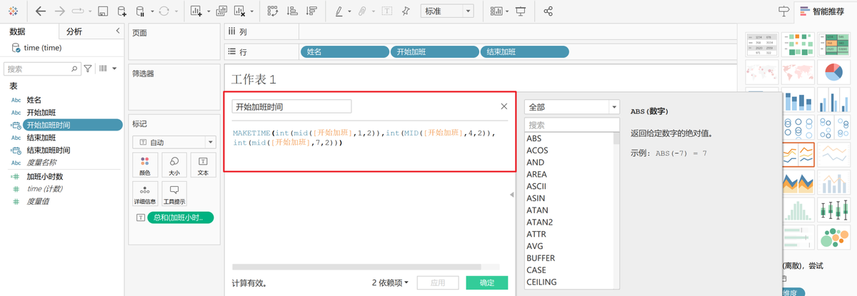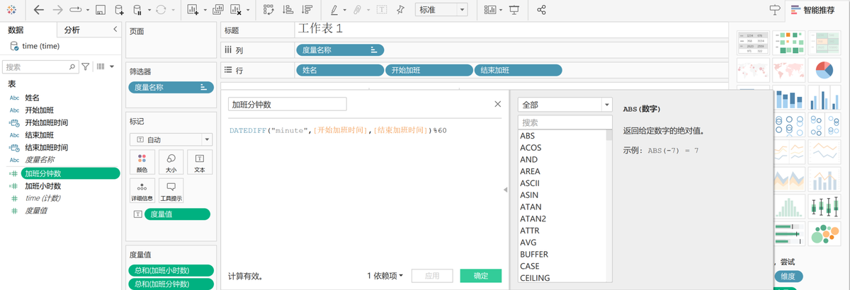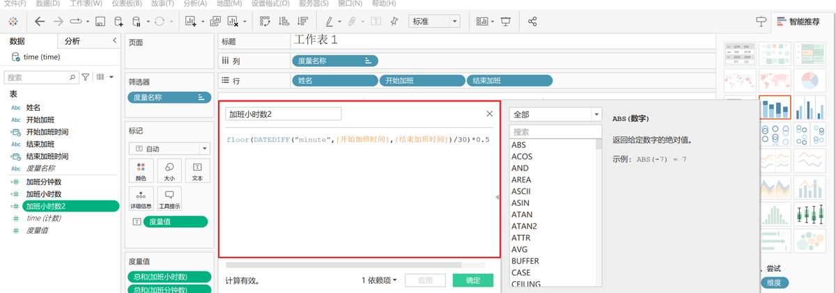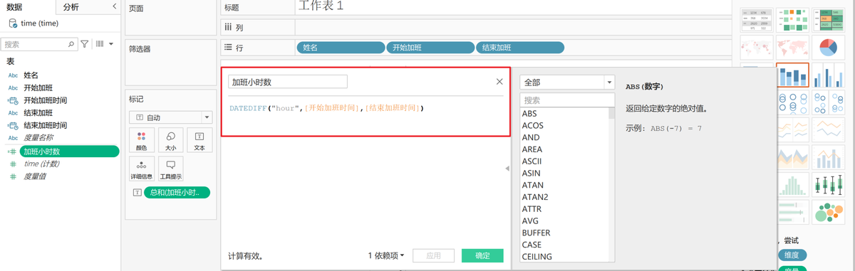 然后创建一个计算字段命名为“加班小时数”,输入公式:DATEDIFF("hour",[开始加班时间],[结束加班时间])
