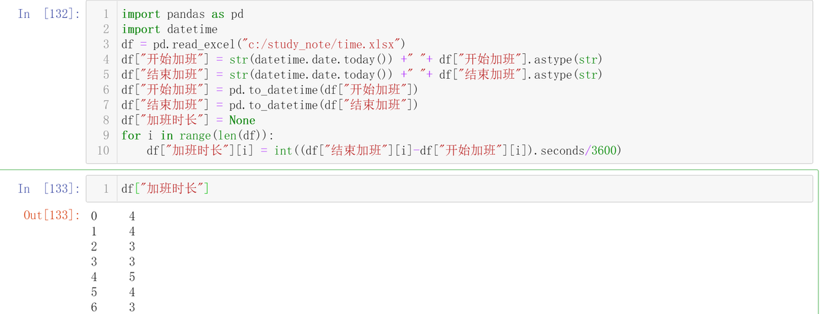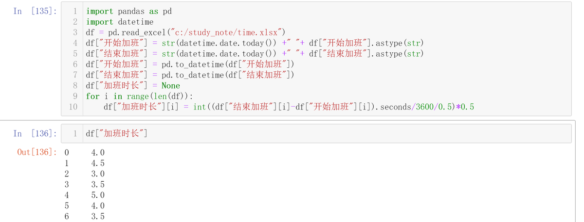 df["加班时长"][i] = int((df["结束加班"][i]-df["开始加班"][i]).seconds/3600/0.5)*0.5