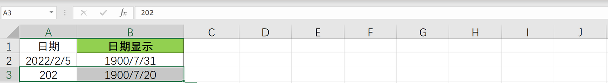 这里第一个参数并不代表2022年2月5日这个日期,而是代表除法计算 = 2022/2/5=202 数字代表的日期1900年7月20日,是计算这个月份的最后一天了