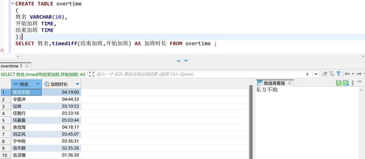 SELECT 姓名,timediff(结束加班,开始加班) AS 加班时长 FROM overtime ;