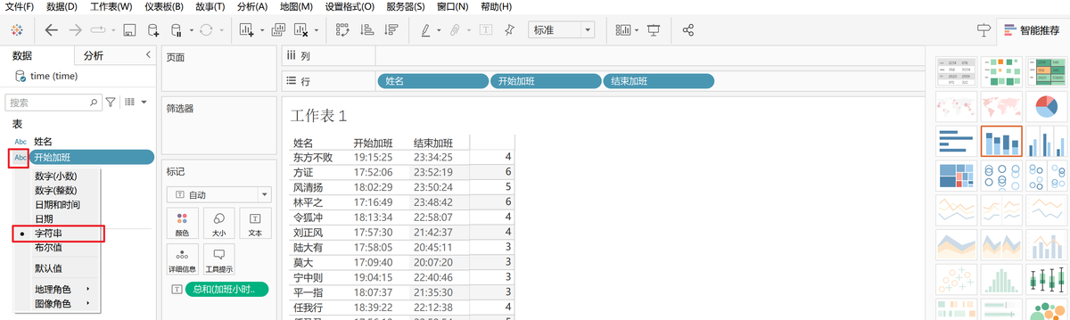 第1步连接到加班表,然后把开始加班和结束加班两个字段全都改为字符串格式,如下: