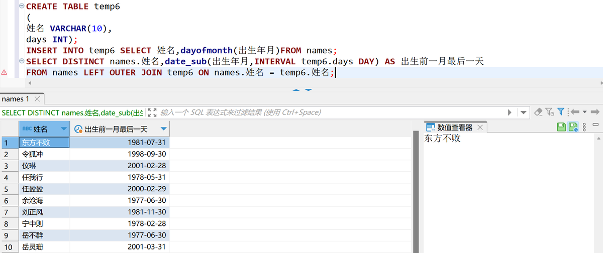 SELECT DISTINCT names.姓名,date_sub(出生年月,INTERVAL temp6.days DAY) AS 出生前一月最后一天