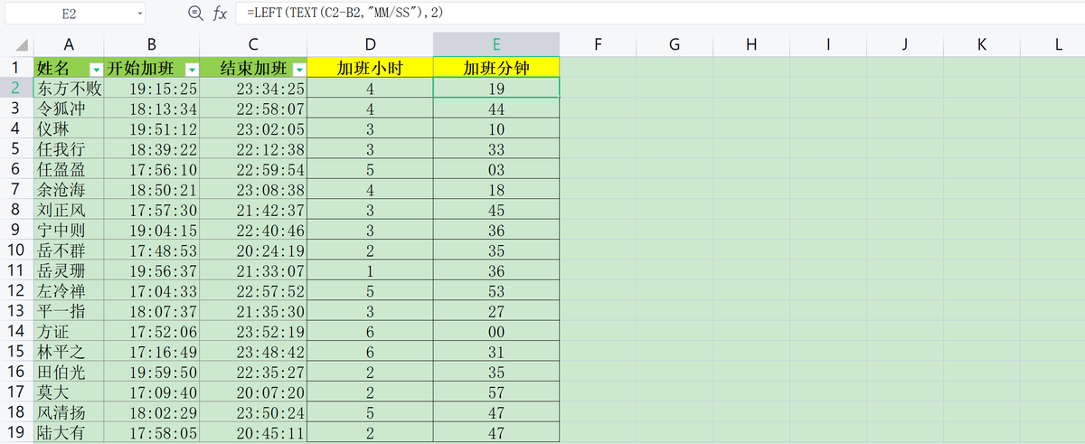E2单元格=LEFT(TEXT(C2-B2,"MM/SS"),2)