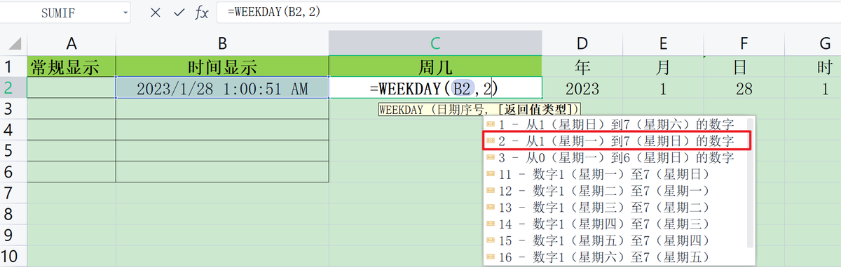 默认天数是 1表示(星期日)到 7表示(星期六)范围内的整数,如果想让星期一变为1,则需要把第二个参数填2,如下: