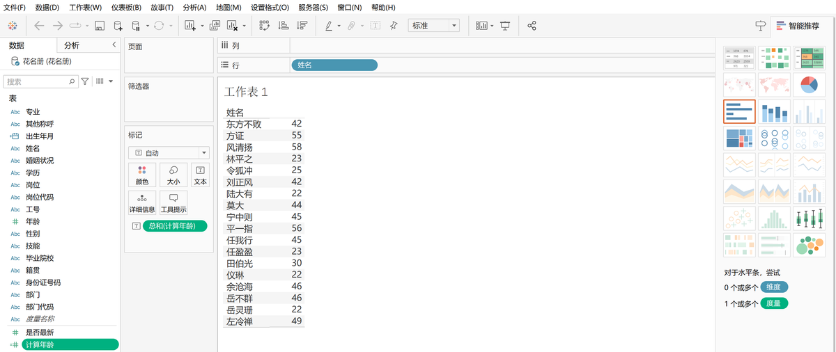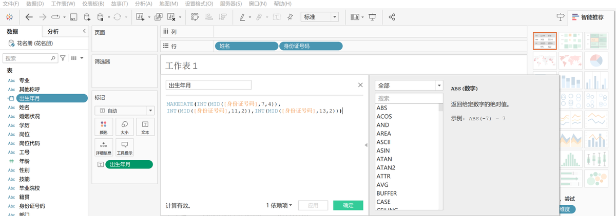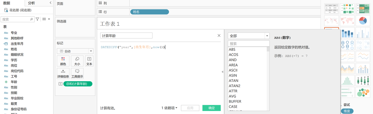创建计算字段“计算年龄”,输入公式:DATEDIFF("year",[出生年月],now())