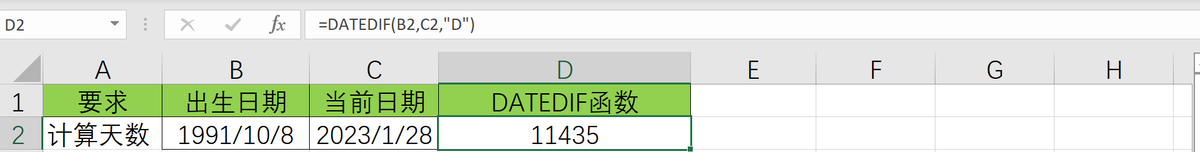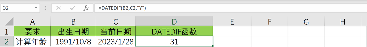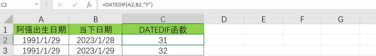 注意这个年龄和前面的年龄不一样,前面是直接用年这个参数相减得到的年龄,用DATEDIF取的话是考虑到月份和天数,比如1991年1月29日出生的人,当下日期为2023年1月28日,如果用年数相减得到今年32岁,但是用DATEDIF取的话就是31岁,因为精确到天数的话并没有满1年,取不到32,如下: