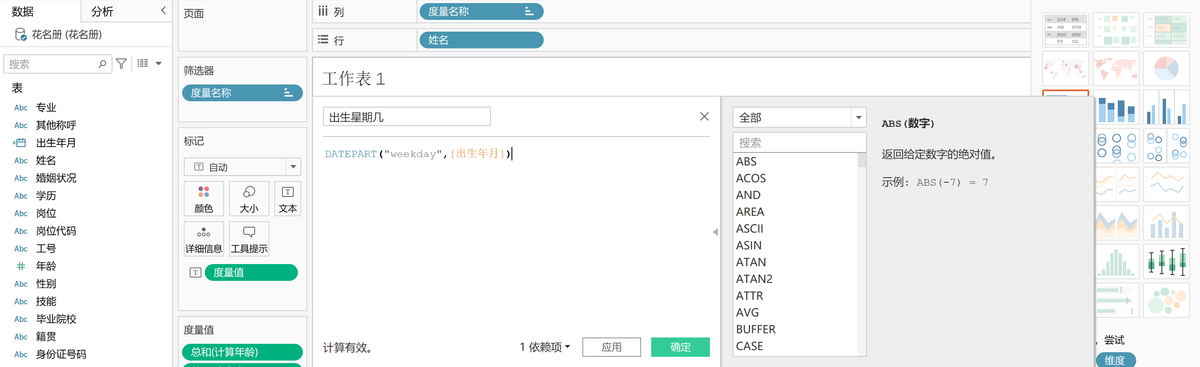 创建计算字段出生星期几,输入公式:DATEPART("weekday",[出生年月])