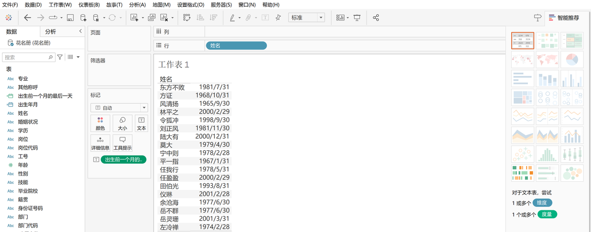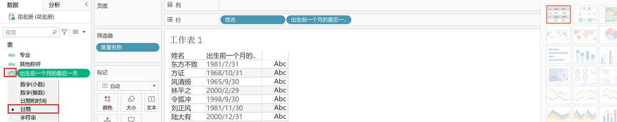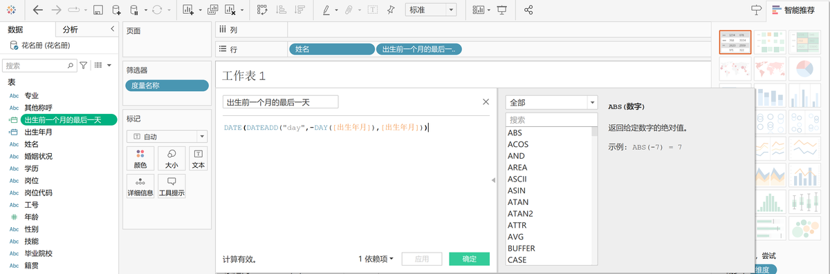 创建计算字段出生前一个月的最后一天,输入公式:DATE(DATEADD("day",-DAY([出生年月]),[出生年月]))