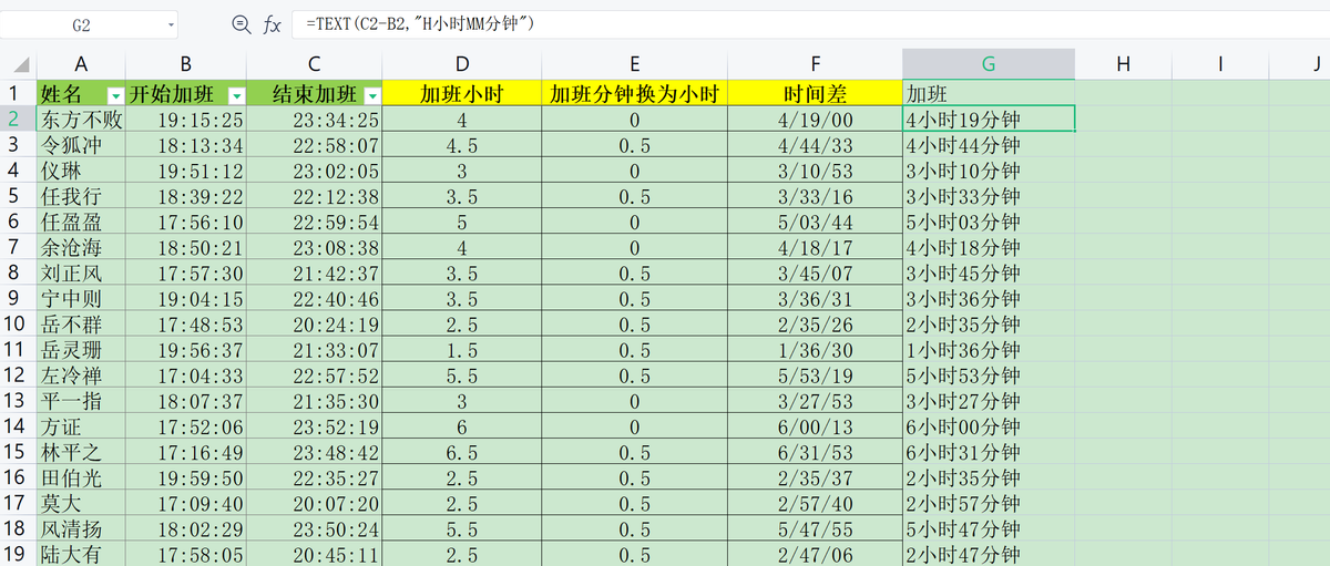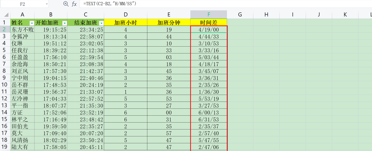 我们也可以在输入公式=TEXT(C2-B2,"H/MM/SS"),得到是完整的时间差