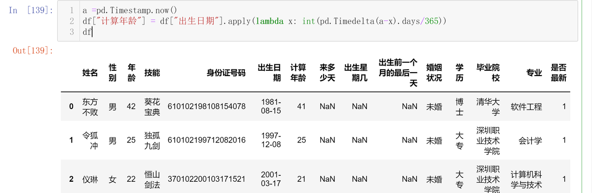 df["计算年龄"] = df["出生日期"].apply(lambda x: int(pd.Timedelta(a-x).days/365))