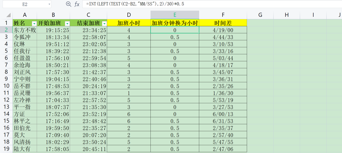 7提取加班时长,取整到小时数和分钟数,分钟数以30分钟为单位,小于30分钟的不计算,大于等于30分钟小于60钟的按0.5小时算