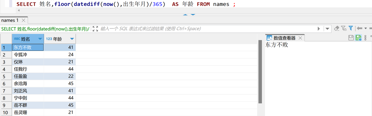 SELECT 姓名,floor(datediff(now(),出生年月)/365) AS 年龄 FROM names ;