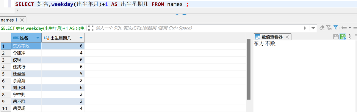 SELECT 姓名,weekday(出生年月)+1 AS 出生星期几 FROM names ;