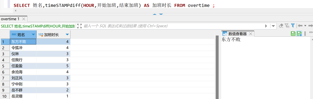 SELECT 姓名,timeSTAMPdiff(HOUR,开始加班,结束加班) AS 加班时长 FROM overtime ;