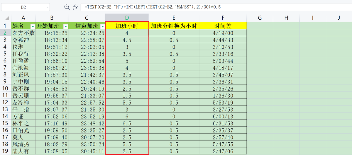 我们可以看到加班分钟数小于30分钟的按0小时计,大于等于30分钟的按0.5小时计,然后把这个公式加到D列单元格公式即可,D列则是我们要的结果