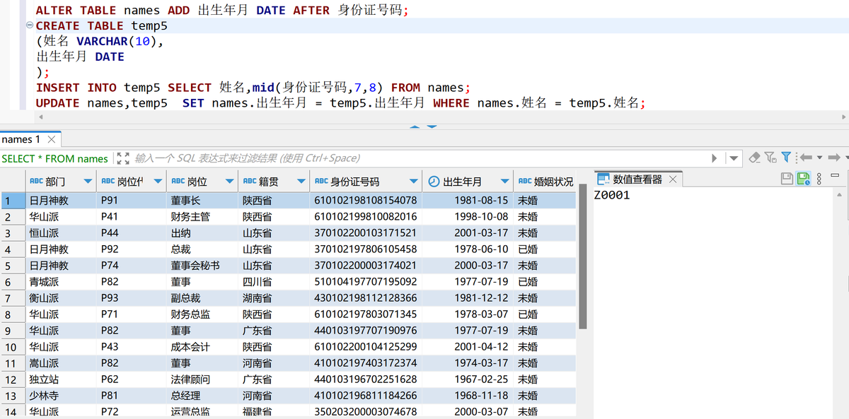 ALTER TABLE names ADD 出生年月 DATE AFTER 身份证号码;